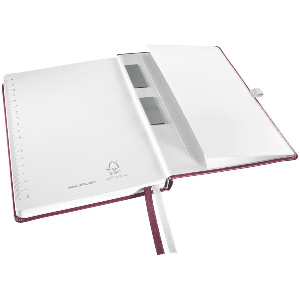 - notatnik o uznanej jakości Leitz Premium - nowoczesne wzornictwo, atrakcyjne szczotkowane wykończenie i wyrafinowane kolory - zintegrowana, poszerzana kieszeń na wewnętrznej stronie przedniej i tylnej okładki umożliwia szybki dostęp do luźnych kartek i drobiazgów - 80 kartek wysokiej jakości papieru w kolorze kości słoniowej, z certyfikatem FSC® i gramaturą 100 g/m2 - format A5, kratka