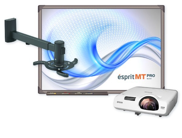 W zestawie: tablica interaktywna ésprit MT Pro, projektor bliskiej projekcji EB-520 (technologia 3LCD, jasność 2700 lumenów światło białe i kolorowe, rozdzielczość 1024 x 768 (XGA), kontrast 16000:1 dystans 0,5 - 1,3 m) oraz uchwyt do projektora US1